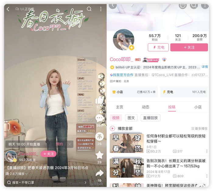 55.7万粉丝的时尚区UP主“Coco叩叩_”,日常视频里专注于梨型身材的穿搭,赢得了不少梨型身材女性的口碑与认可。2024年3月,她正式在B站开启直播带货,首播销售额便超过了1700万元。