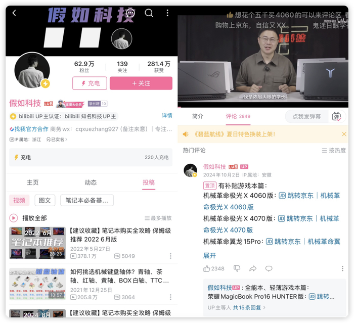 比如B站粉丝62.8万的科技区UP主“假如科技”,擅长笔记本评测。2024年10月,“假如科技”发布了一条保姆级笔记本购买全攻略视频,从CPU、显卡、内存、硬盘、屏幕、接口等维度深度测评几款新上市笔记本性能,并在评论区放上了相关产品的京东购买链接。