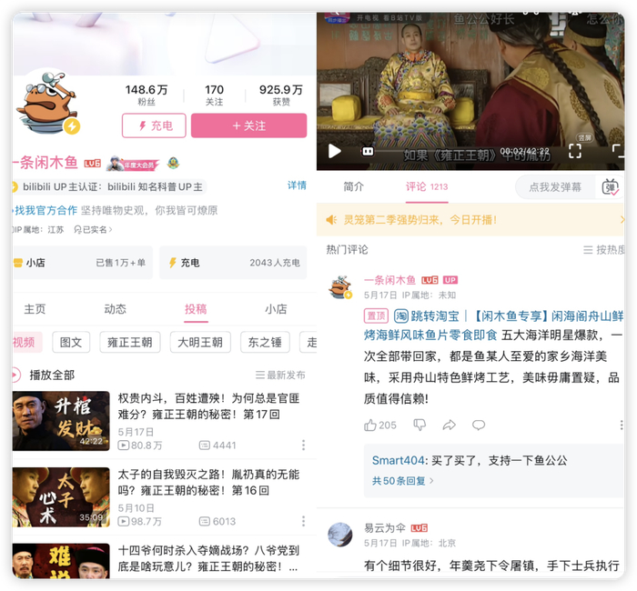 就像B站148万粉丝的知识UP主“一条闲木鱼”,主要做历史影视内容解说,例如解说《大明王朝》《雍正王朝》。他会在视频评论区挂上带货蓝链,带货商品既有特产小吃,也有按摩仪、沐浴露等日用品,知情人士透露他每条带货视频的收益能达到数万元。