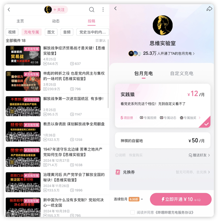 “思维实验室”也发布了18条党史故事类的充电视频,累计有27.5万人充电,据他透露,目前充电收入已经占到总收入的一半。