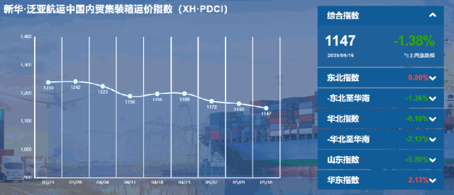 核心提示:本期(5月10日至5月16日),新华·泛亚航运中国内贸集装箱运价指数(XH·PDCI)报1147点,较上期(2025年5月3日至5月9日)下跌16点,跌幅1.38%,同比上涨143点,涨幅14.24%;6只区域子指数“两涨四跌”,4只流向子指数“一涨三跌”。