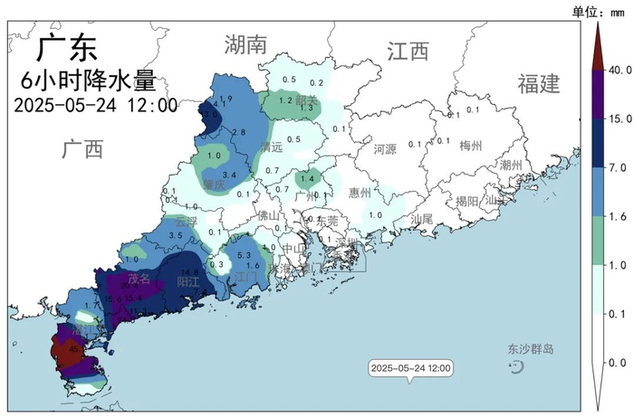 省气象台预计,24日,珠江口以西市县有中到大雨,其中湛江、茂名市县局地有大暴雨,并伴有8级局地10级雷雨大风。待到25日—26日,广东降雨明显减弱。
