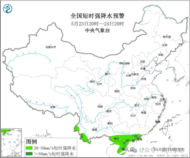 根据中央气象台消息,预计5月23日20时—24日20时,广东西南部的部分地区将有小时雨量大于20毫米的短时强降水天气,其中广东西南部、海南岛北部等地的局部地区小时雨量大于50毫米,最大可达80毫米以上。