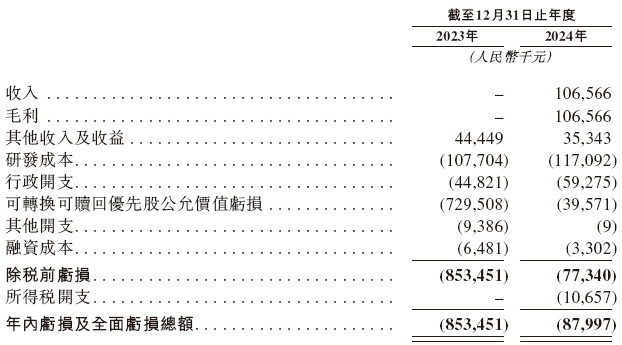 招股书显示,在过去的2023年和2024年,科望医药的营业收入分别为人民币0元、1.07亿元,相应的研发开支分别为人民币1.08亿、1.17亿元,相应的净亏损分别为人民币8.53亿、0.88亿元。