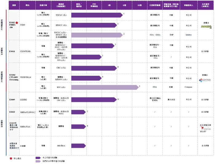 其他临床阶段的资产包括ES014(全球首个进入临床阶段的CD39/TGFs bsA)、ES104(一种差异化bsAb,全球仅有的两种VEGF/DLL4 bsAb之一,是全球仅有的处于活跃临床开发阶段的VEGF/DLL4 bsAbb)、ES009(一种靶向LILRB2、具有同类最佳潜力的差异化mAb)。