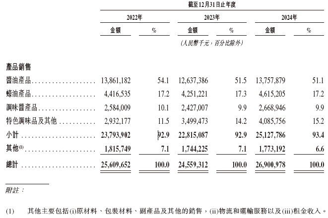 海天味业,按销量计已连续28年蝉联中国最大调味品企业。公司的酱油、蚝油产品销量多年位居中国调味品市场第一,调味酱、食醋及料酒亦位居中国市场前列。于2024年,具体如下:
