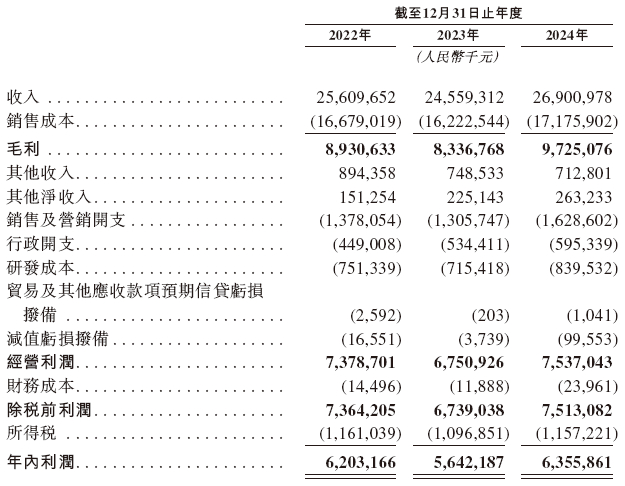 招股书显示,在过去的2022年、2023年和2024年,海天味业的营业收入分别为人民币256.10亿、245.59亿和269.01亿元,相应的净利润分别为人民币62.03亿、56.42亿和63.56亿元。