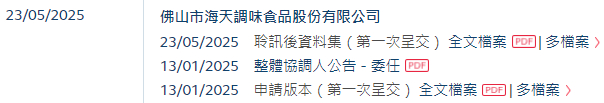 2025年5月23日,佛山市海天调味食品股份有限公司 Foshan Haitian Flavouring And Food Company Ltd. (下称"海天味业”)在港交所披露聆讯后的招股书,或很快在香港主板挂牌上市,其此前于2025年1月13日递交招股书。