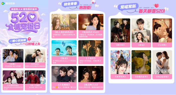 比如腾讯视频推出“520全糖宠粉日”主题页面,并在微博发起#腾讯视频520剧爱你#话题,将站内10余部热播、待播及过往经典爱情题材剧集打包推广,以差异化物料吸引新老用户关注。