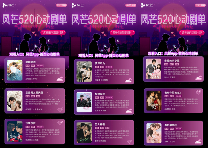 同时值得关注的是,以红果、风芒为代表的短剧平台首次高调加入520的档期之战,推出相应片单与长剧抢占大盘流量。