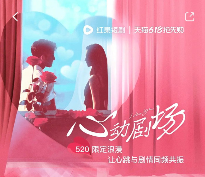 以红果短剧为例,继春节档、五一档之后,其又抓住了520这一节点在站内推出了聚焦情感题材的“心动剧场”,并与天猫618抢先购联合呈现。