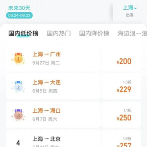 5月31日上海飞北京,单程经济舱票价打了1.6折,只需257元(不含税)。