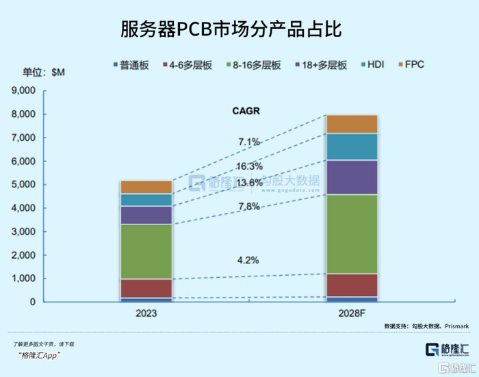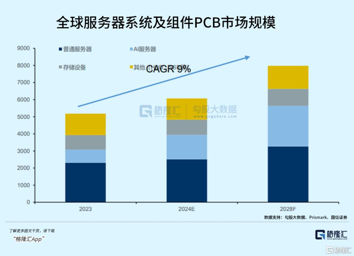 根据Prismark,与服务器及相关系统组件的PCB市场规模预计未来将以9%的增速提升,2028年达到79.74亿美元。
