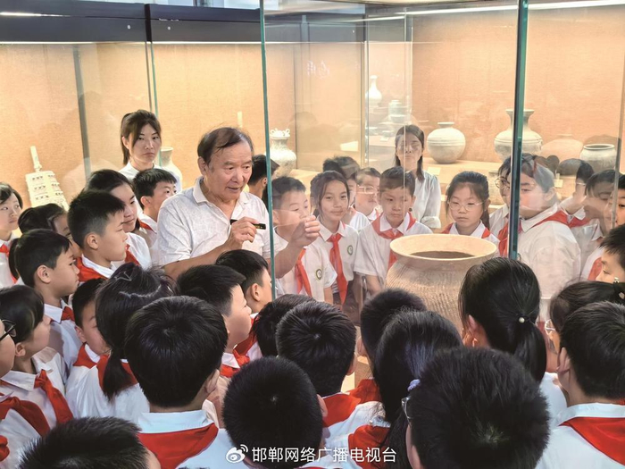 5月18日,国际博物馆日,来自曲周县爱迪小学的学子走进曲周博物馆,探寻历史的奥秘。李治山化身为讲解员,为学生们讲起了“锅的起源”。