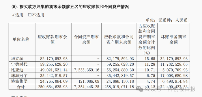 其年报披露的“按欠款方归集的期末余额前五名的应收账款和合同资产情况”一项中,华立源、宁德时代、比亚迪、珠海冠宇、协鑫集团为相关额度前五名的欠款方。