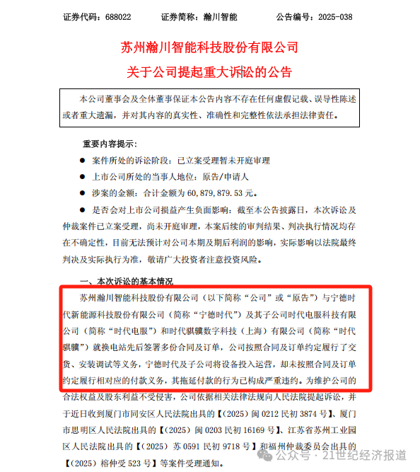 公告显示,涉案合计金额为6087.99万元。值得注意的是,瀚川智能2024年年报显示,其对宁德时代的应收账款期末余额为5925.56万元,这与本次诉讼金额基本对得上。