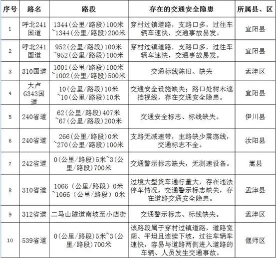 栾川辖区:国道G344东灵线秋扒乡经白土镇至三川镇段道路施工,车辆可缓慢通行;国道G241呼北线狮子庙车庄至赤土店庄科路段道路施工,车辆可绕行至五肩头道路行驶;县道X318冷陶线张盘至焦树凹段全线道路施工,禁止车辆通行。