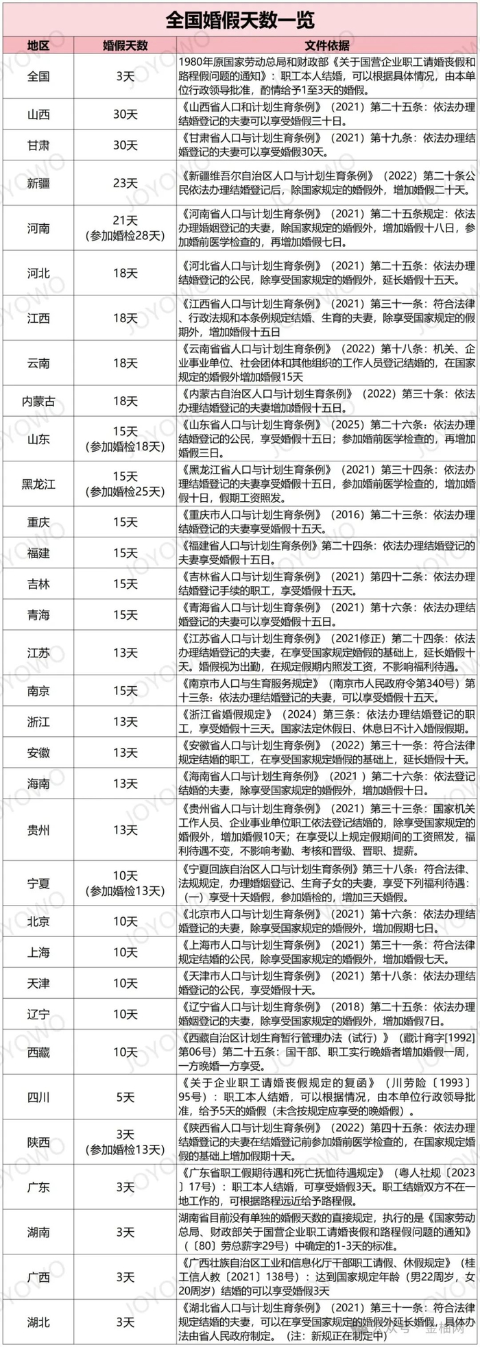 从全国来看,有些省份已明确延长婚假,例如江西、云南、河北、内蒙古为18天,浙江、安徽、江苏、贵州、海南为13天,北京、上海、天津、辽宁、西藏为10天。