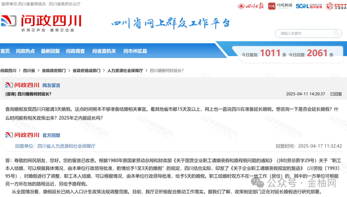 有网友近期通过“问政四川”平台留言:四川婚假何时延长?
