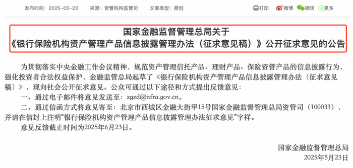 5月23日晚间,国家金融监督管理总局(以下简称金融监管总局)发布了《银行保险机构资产管理产品信息披露管理办法(征求意见稿)》(以下简称《办法》),系统规范了资产管理信托产品、理财产品、保险资管产品的信息披露行为,推动同类业务实施统一监管标准,强化投资者合法权益保护。