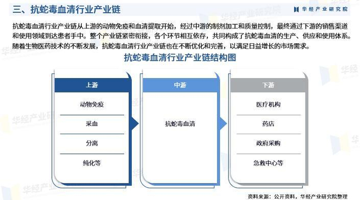 抗蛇毒血清行业产业链从上游的动物免疫和血清提取开始,经过中游的制剂加工和质量控制,最终通过下游的销售渠道和使用领域到达患者手中。整个产业链紧密衔接,各个环节相互依存,共同构成了抗蛇毒血清的生产、供应和使用体系。