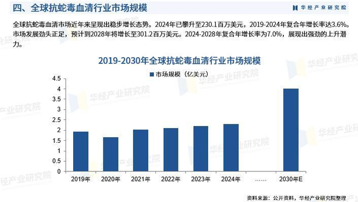 全球抗蛇毒血清市场近年来呈现出稳步增长态势。2024年已攀升至230.1百万美元,2019-2024年复合年增长率达3.6%。市场发展劲头正足,预计到2028年将增长至301.2百万美元。