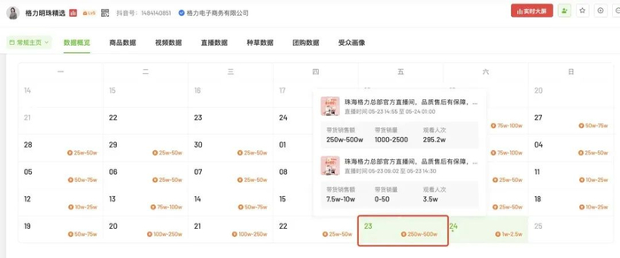 飞瓜数据显示,当晚“格力明珠精选”直播间观看人次达到292万,巅峰在线人数超过3万人,带货销售额高达500万元。带货成绩一度登上“大家电榜”第1名。