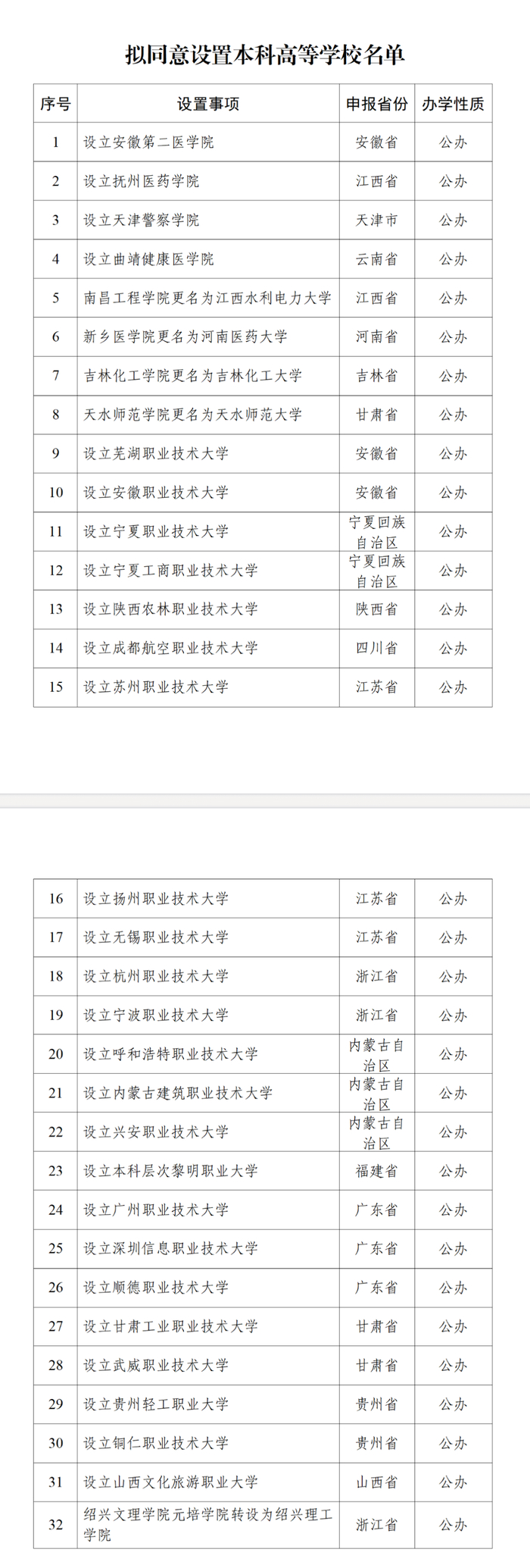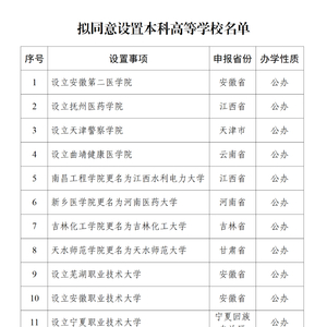 根据《中华人民共和国高等教育法》《普通高等学校设置暂行条例》《普通本科学校设置暂行规定》《本科层次职业学校设置标准(试行)》等有关规定以及第八届全国高等学校设置评议委员会考察评议结果,经教育部党组会议审议,拟同意设置安徽第二医学院等32所学校,现予公示。