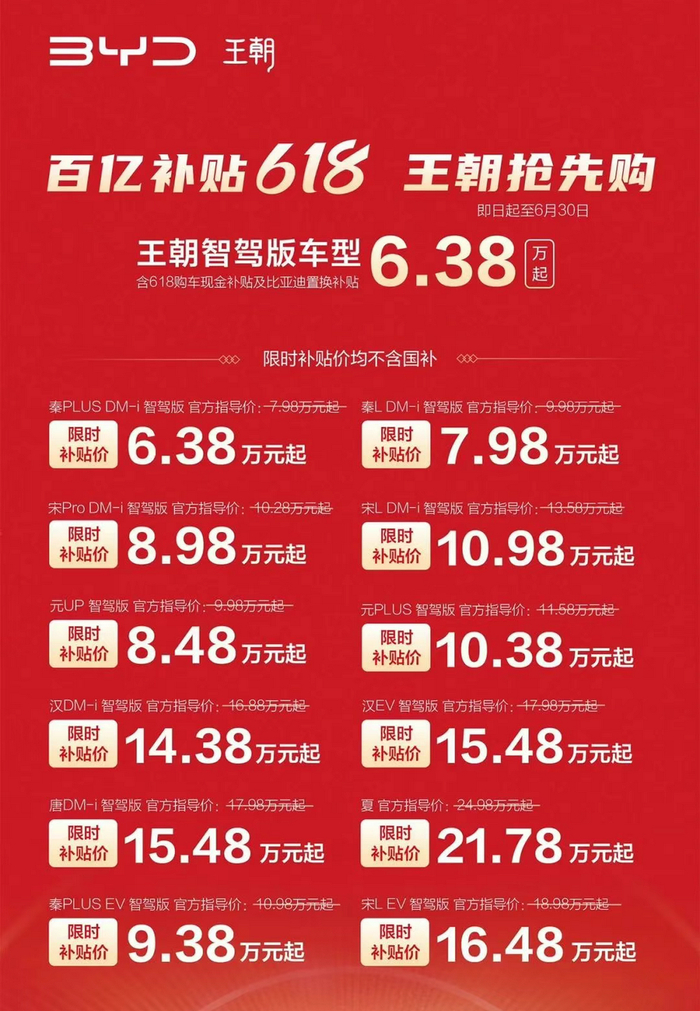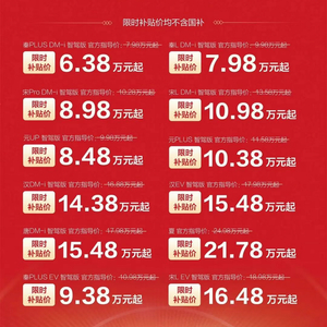 王朝网以“百亿补贴 618”活动为核心,旗下12款智驾车型均提供限时补贴(不含国家补贴),活动持续至6月30日,起售价低至6.38万元。其中,秦PLUS DM-i 智驾版从7.98万元起售直降至6.38万元起,优惠1.6万元;宋L DM-i 智驾版官方指导价13.58万元起,补贴后仅需10.98万元起,直接让利2.6万元;汉DM-i、唐DM-i智驾版等车型补贴后的优惠差价也均达到2.5万元,整体补贴区间在1.3万-3.2万元。