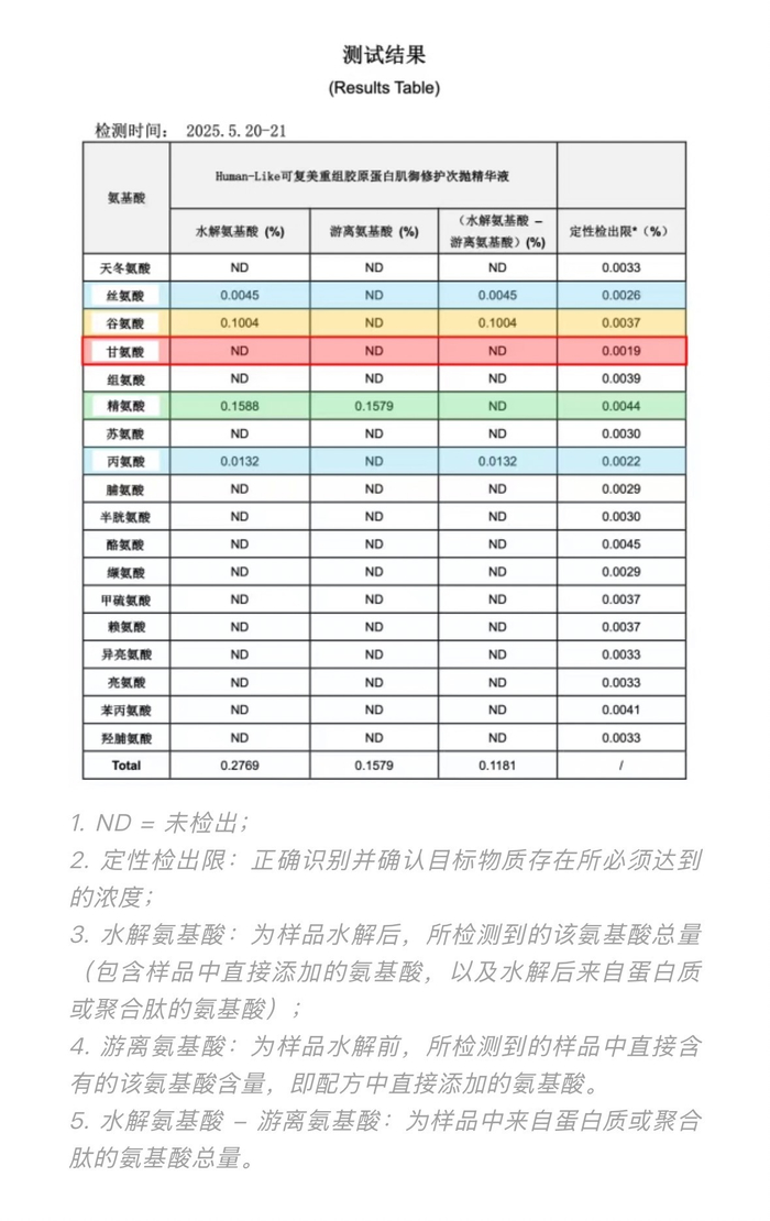 然而郝宇的检测报告显示,可复美“胶原棒”中并未检出甘氨酸。这一发现直接挑战了巨子生物重组胶原蛋白技术的真实性——若连基础结构成分都不存在,所谓“重组胶原”可能仅是营销概念。