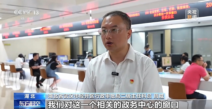湖北省武汉市经开区行政审批局二级主任科员 周威:我们对这一个相关的政务中心的窗口,企业登记、税务,企业迁移、内资外资,以及食品药品等(业务办理)全部集中在这一层。相当于企业一天之内,可以把所有的事情办完,不需要企业再跑腿,后台内部来进行流转就可以了。
