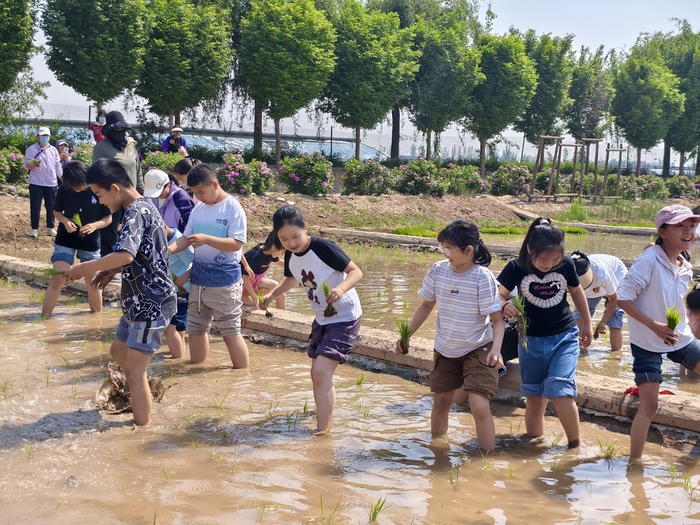 在宁夏稻渔空间生态观光园,参与者们在讲解员的引导下登上观景塔,一览大地艺术的壮丽景色。走在田间栈道上,他们认真聆听关于水稻养鱼、鱼稻共生的故事,感受塞上乡村的魅力,解密稻鱼共生的秘密,体验稻渔产业之美。来到劳动实践区,他们卷起裤脚走进泥田,孩子们学着“师傅”的样子,用指尖捏着秧苗,弓腰插入松软的泥土中,看着嫩绿的秧苗在水田中“列队”,深刻体会到了劳动的自豪与不易。