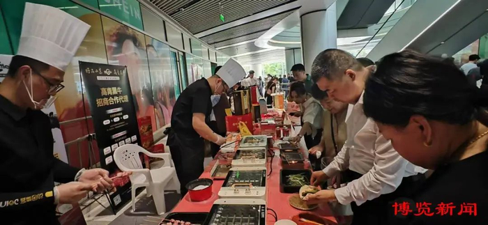 品尝区内,各类美食香气四溢,引得参观者纷纷驻足。这边,拥有雪花般纹理的高青黑牛在炭火的烤制下,散发出诱人的香气,瞬间抓住食客的味蕾;另一边,几位大湾区食客正学着左手摊开香软的小饼,右手拿起肉串,再蘸上秘制酱料,一个香喷喷的小饼卷肉就做好了。“这搭配简直太妙了。”香港餐饮客商李女士举着刚卷好的小饼,眼中满是惊喜,“淄博能把食材的本味吃法和仪式感结合得这么好,非常值得我们学习!”