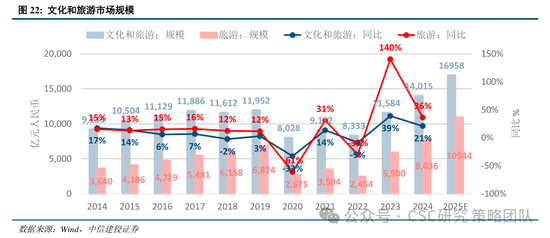 文化和旅游的消费升级,是目前主要消费分项中增速最高、弹性最显著的领域。科技创新、文化自信和文旅消费共振,促进文旅消费潜力的持续释放。2024年我国居民部门的文旅和旅游消费支出规模,分别实现了21%和36%的两位数年增,年市场增量规模在千亿以上。