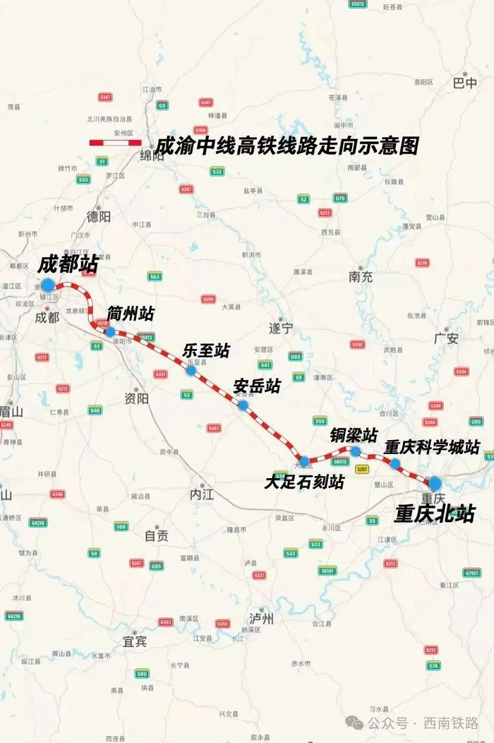 成渝中线高铁是我国“八纵八横”高铁网沿江通道的重要组成部分,线路自重庆枢纽重庆北站起,向西经重庆市渝北区、沙坪坝区、璧山区、铜梁区、大足区,四川省资阳市、成都市,引入成都枢纽成都站,正线全长292公里,设计时速350公里。项目建成后,成渝两地旅行时间进一步压缩,将极大便利沿线人民群众出行,对助力成渝地区双城经济圈建设,形成西部大开发新格局,具有十分重要的意义。