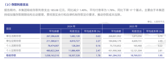 2024年,沪农商行的利息支出185.08亿元,同比减少1.40%,平均付息率为1.78%,同比下降17个基点。