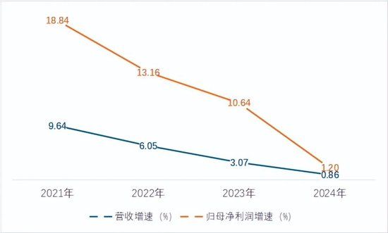 先来看业绩方面,2021年至2024年,沪农商行的营收增速分别为9.64%、6.05%、3.07%、0.86%,4年间,该行营收增速下降至不足1%;归母净利润增速下降也明显,从2021年的18.84%下降至1.20%。