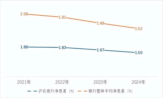 2021年至2024年,沪农商行的净息差分别为1.86%、1.83%、1.67%、1.50%;而商业银行整体平均值为2.08%、1.91%、1.69%、1.52%。
