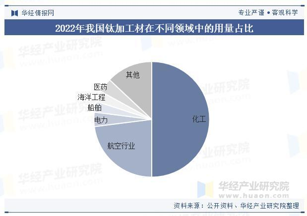 从国内钛材消费结构来看,我国虽然是全球最大的钛金属生产国和消费国之一,但整体呈现民用化和低端化的特征,我国钛制品需求大部分来自化工领域,应用主要为抗腐蚀材料,技术含量相对不高,航空航天领域高端需求,虽然近两年占比有所提升,但仍远不及国际平均水平。2022年国内钛材消费结构中,化工与航空航天作为前两大应用领域,消费量分别达到7.3万吨、3.3万吨,分别占比50.34%、22.76%。