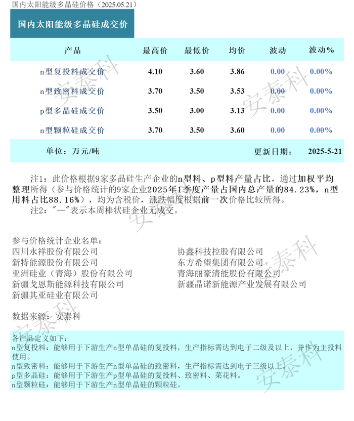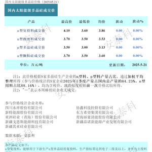 细分品类中,n型复投料、颗粒硅及p型多晶硅成交均价分别为3.86万元/吨(3.6-4.1万元/吨)、3.6万元/吨(3.5-3.7万元/吨)、3.13万元/吨(3-3.5万元/吨),整体呈现底部企稳迹象,且硅片、电池片及组件价格同步趋稳,印证全产业链触底趋势。