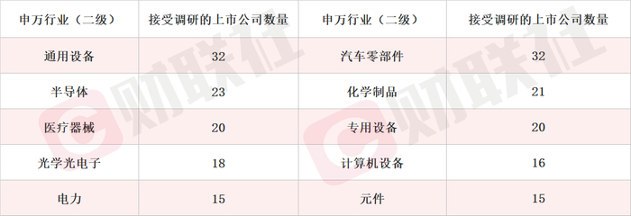 细分领域看,通用设备、汽车零部件和半导体板块位列机构关注度前三名。此外,电力、元件等行业机构关注度提升。