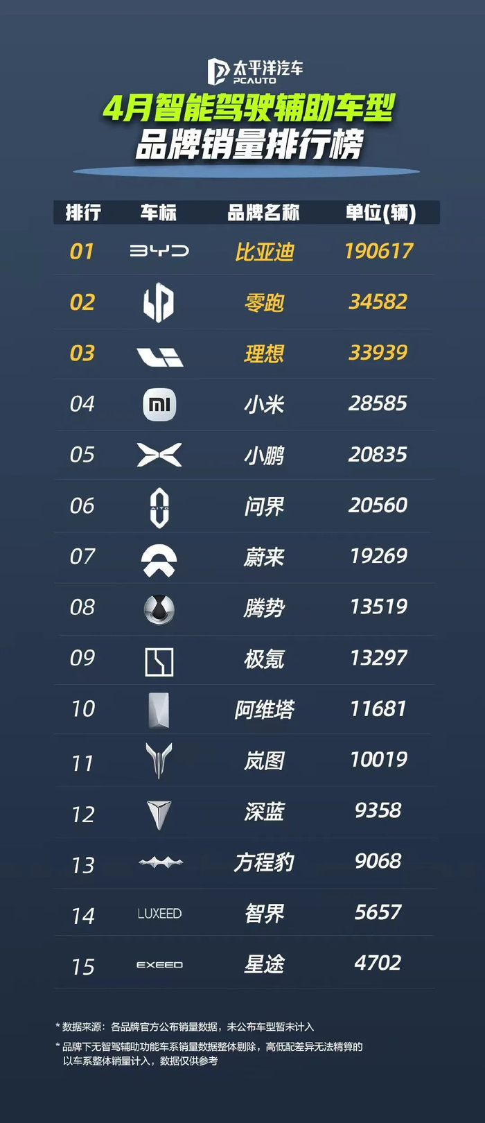 据统计,4月份,比亚迪的智驾车型销量居首位,断层领先。