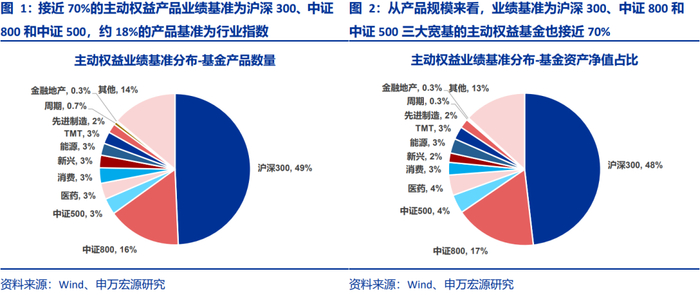根据 2024 年年报披露统计,4403 只主动权益基金样本中,接近 70%的主动权益产品业绩基准为沪深 300、中证 800 和中证 500 三大主流宽基指数,从产品规模来看比例也接近 70%。此外,行业指数中,医药、消费、新兴、能源为基准的产品数量占比均在 3%左右,其次是先进制造(2%)、周期(0.7%)和金融地产(0.3%)。
