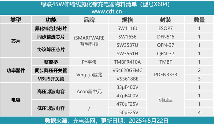 最后附上绿联45W伸缩线氮化镓充电器的核心器件清单,方便大家查阅。