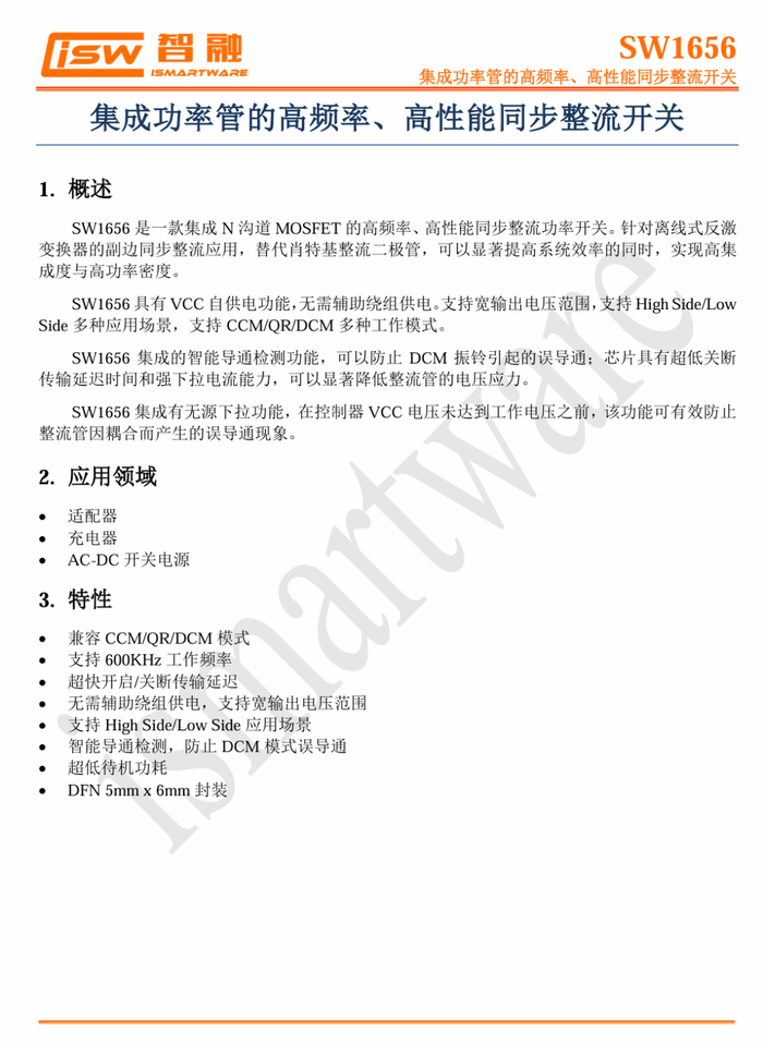 SW1656内部集成智能导通检测功能,可以防止DCM工作模式振铃引起的误导通,芯片具有超低关断延迟时间和强下拉电流能力,降低整流管的电压压力,并集成无源下拉功能,防止同步整流误导通,采用DFN5*6封装。