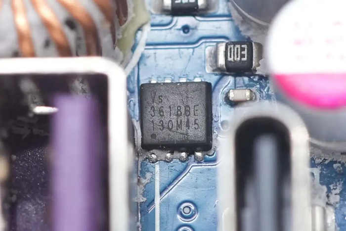 氮化镓合封芯片来自智融科技,型号SW1118J,是针对离线式反激变换器的高性能高集成度准谐振电流模式PWM变换器,芯片内部集成700V耐压,365mΩ的增强型氮化镓开关管,并支持8-90V超宽供电电压,满足PD快充的宽范围输出应用要求。