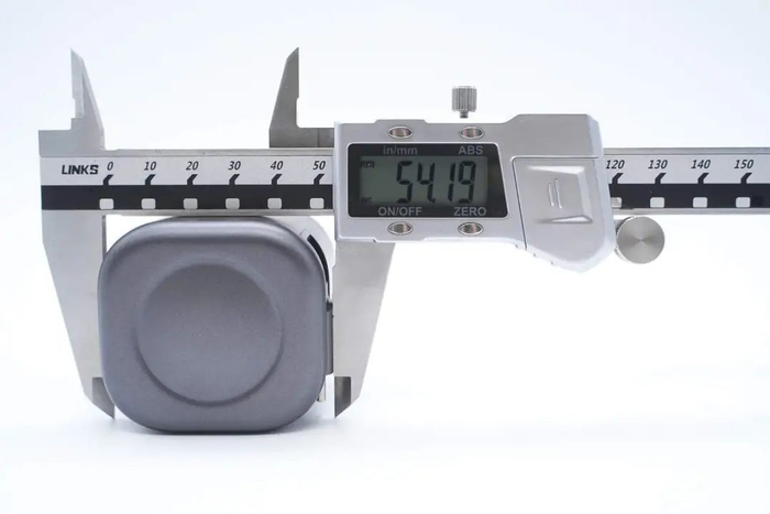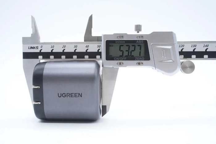 使用游标卡尺测得绿联45W伸缩线氮化镓充电器机身高度约为53.3mm。