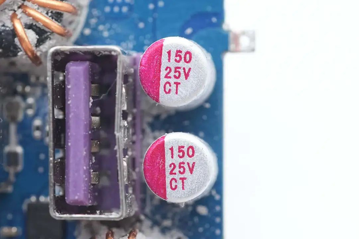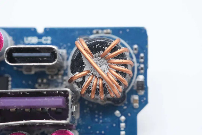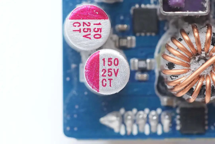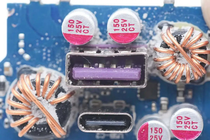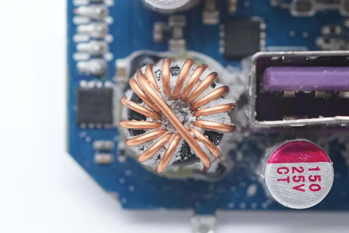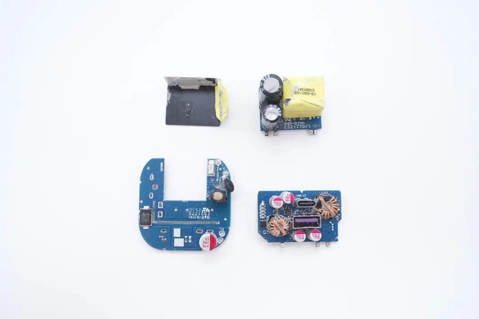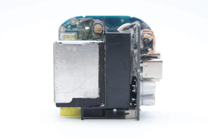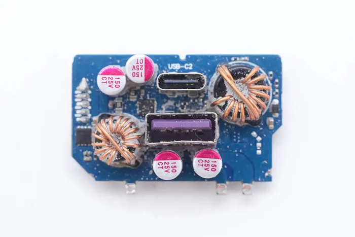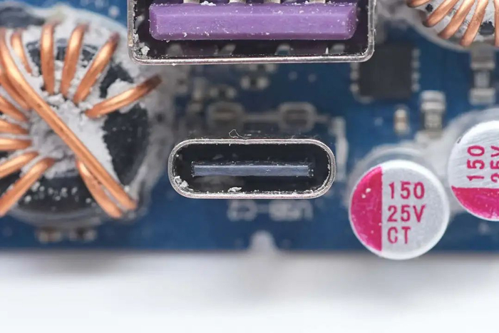 降压芯片使用智融科技SW3537搭配SW3561H,用于两路USB-C和USB-A接口降压输出。充电器输出使用固态电容滤波,PCBA模块整体打胶灌封,提升散热性能和使用体验,内部做工和用料扎实可靠。