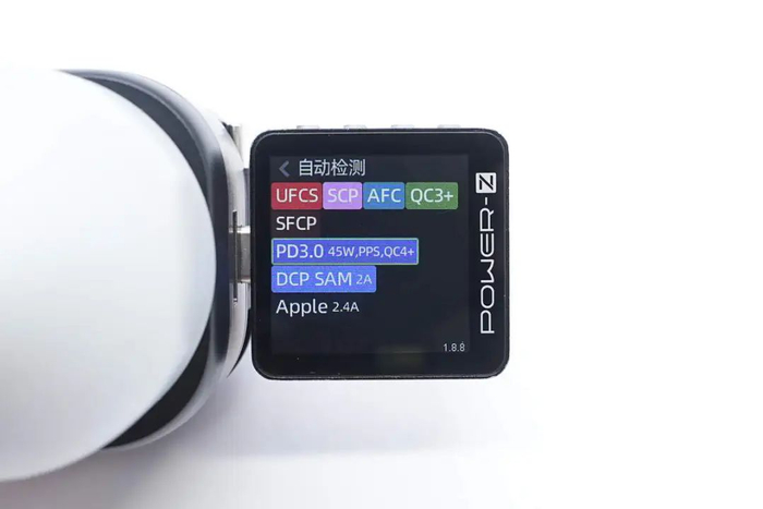 使用ChargerLAB POWER-Z KM003C测得充电器伸缩线输出支持FCP、SCP、AFC、SFCP、QC3/4+、PD3.0、PPS、DCP、SAM 2A、Apple 2.4A充电协议。