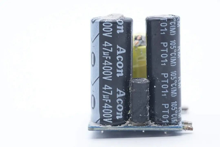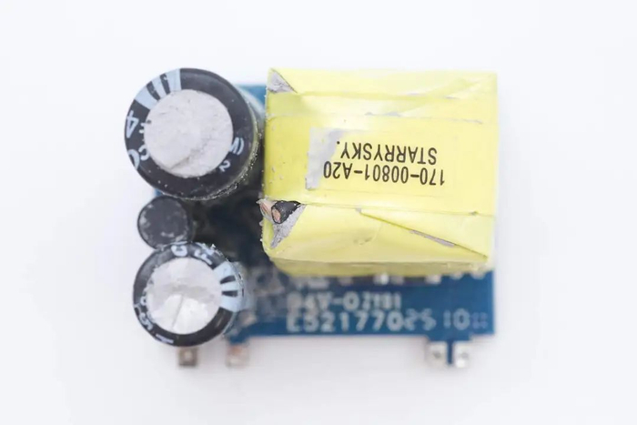 清理掉灌封胶,PCBA模块通过三块小板焊接组成,在初次级之间设有塑料隔离板绝缘。